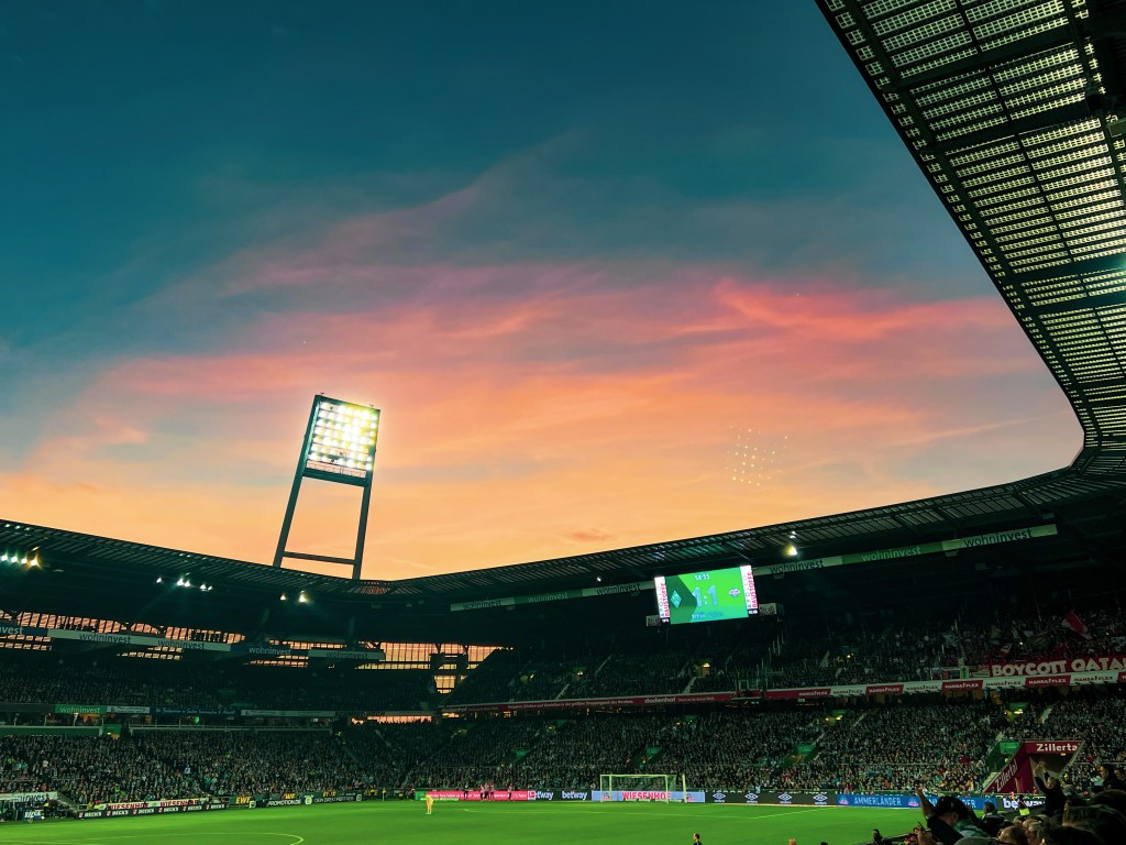 Eine Szene aus dem Weserstadion. Werder gegen Leipzig am 22.11.22. Der Spielstand ist nicht so wichtig, der imposante Himmel und die Formen des Daches verdienen Beachtung. Nur zur Info, Werder verlor das Spiel 1:2.